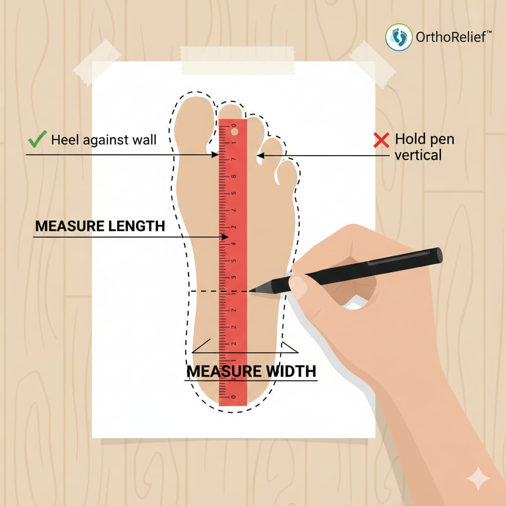 Trace: Stand with your heel against the wall and trace your foot holding the pen straight up.